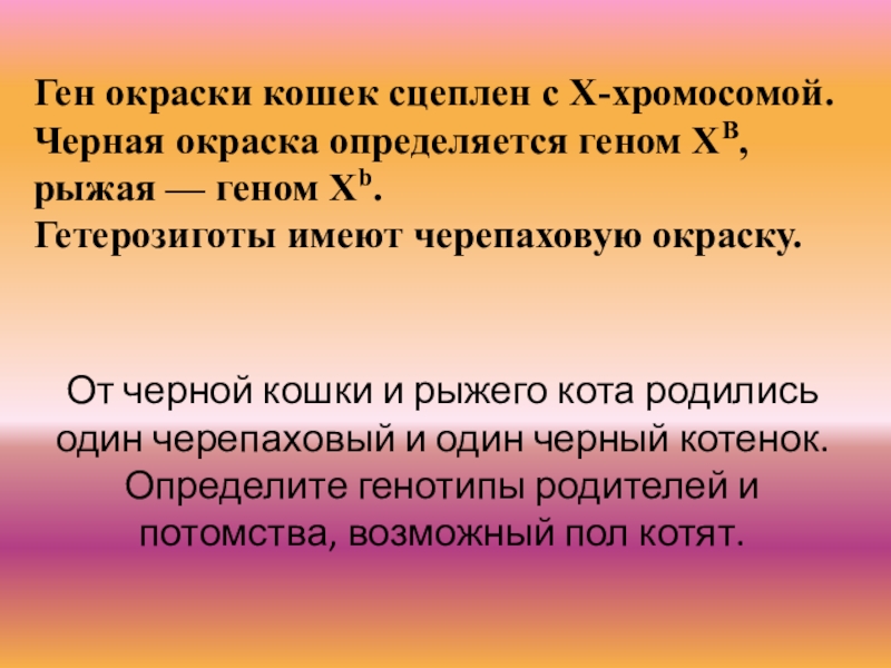 От черной кошки и рыжего кота родились один черепаховый и один черный котенок. Определите генотипы родителей и потомства, возможный пол котят.