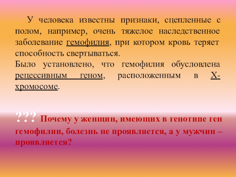 ??? Почему у женщин, имеющих в генотипе ген гемофилии, болезнь не проявляется, а у мужчин – проявляется?