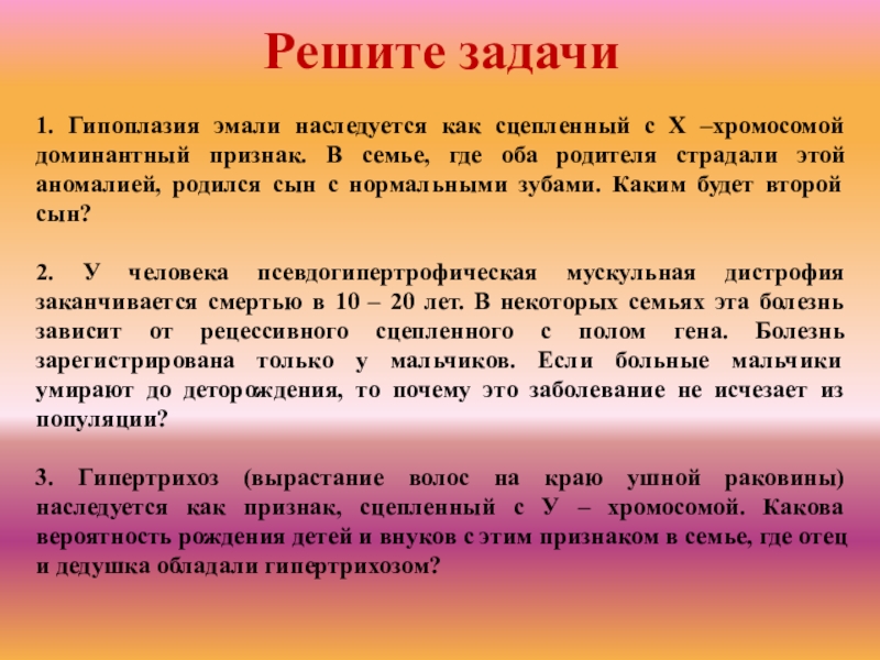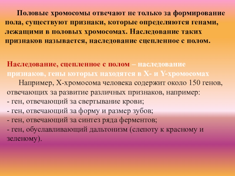 Половые хромосомы отвечают не только за формирование пола, существуют признаки, которые определяются генами, лежащими в половых хромосомах. Наследование таких признаков называется, наследование сцепленное с полом.