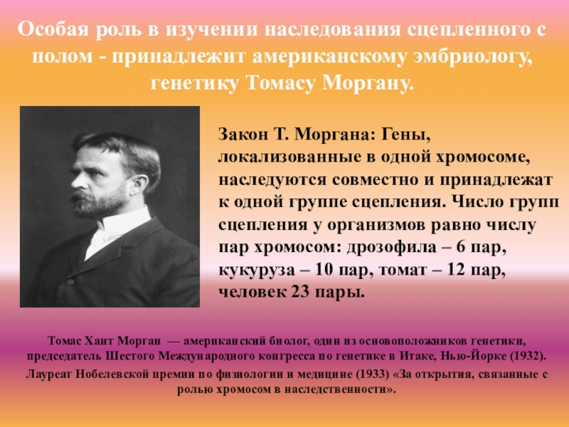 Томас Хант Морган — американский биолог, один из основоположников генетики, председатель Шестого Международного конгресса по генетике в Итаке, Нью-Йорке (1932).