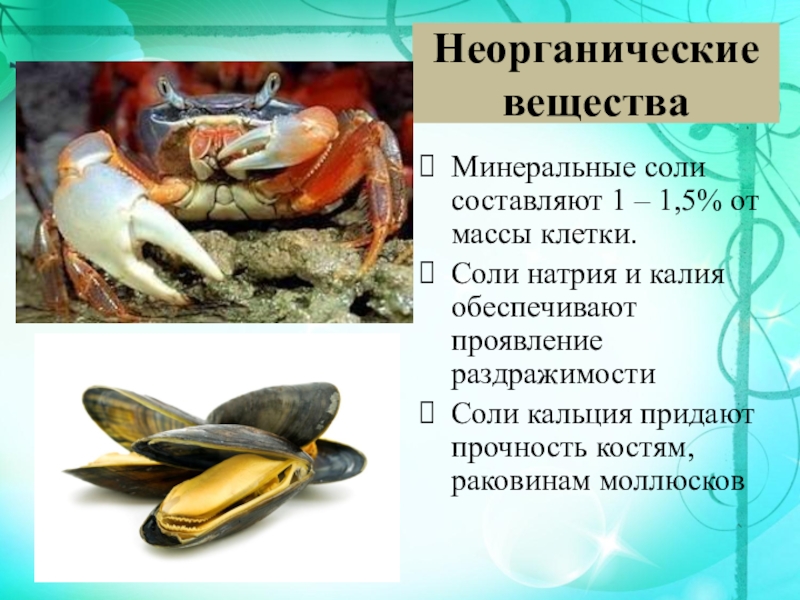 Минеральные соли составляют 1 – 1,5% от массы клетки.