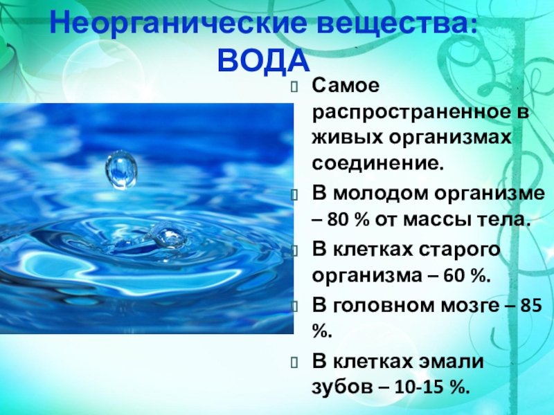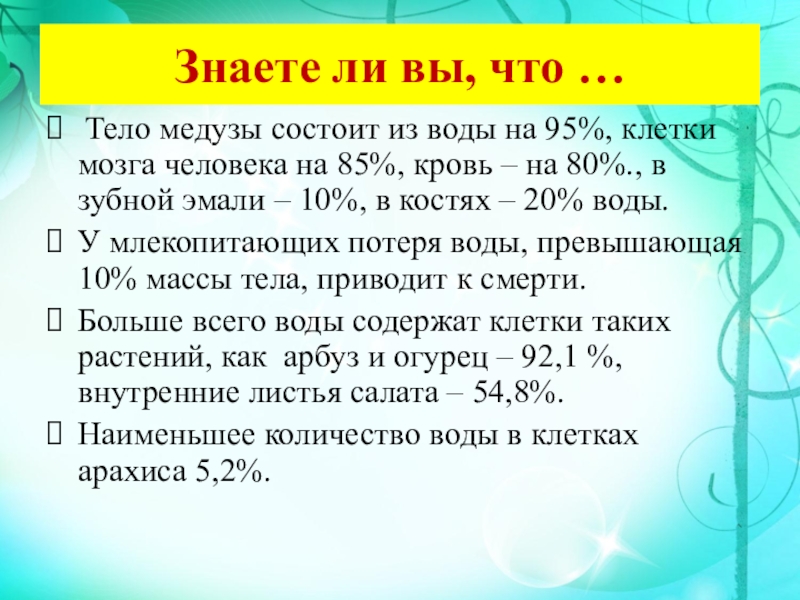 95%, клетки мозга человека на 85%, кровь – на 80%., в зубной эмали – 10%, в костях – 20% воды.