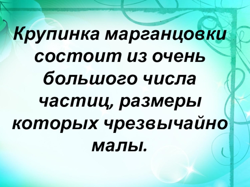 Слайд 17Крупинка марганцовки состоит из очень большого числа частиц, размеры которых чрезвычайно