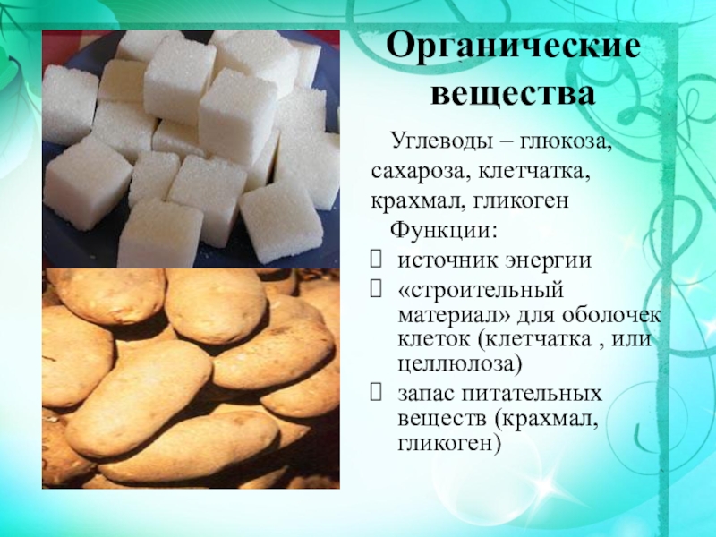 Углеводы (сахар, крахмал), белки, жиры, нуклеиновые кислоты.