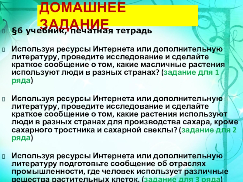 Используя ресурсы Интернета или дополнительную литературу подготовьте сообщение об отраслях промышленности, где человек использует различные вещества растительных клеток. (задание для 3 ряда)
