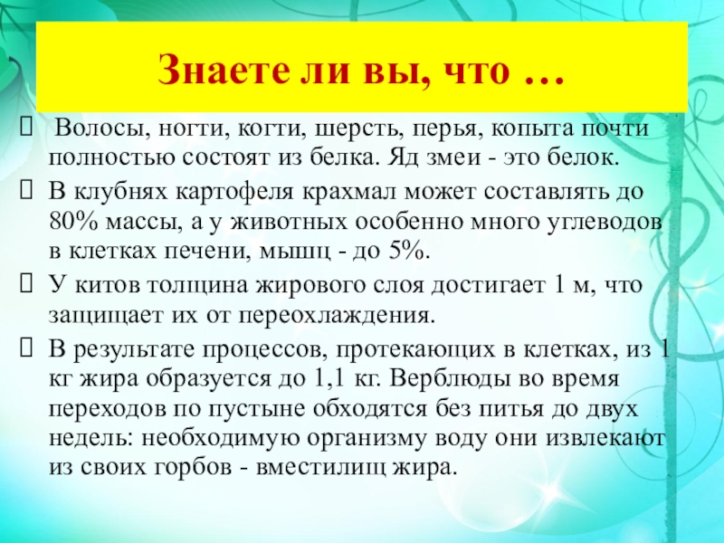 В результате процессов, протекающих в клетках, из 1 кг жира образуется до 1,1 кг. Верблюды во время переходов по пустыне обходятся без питья до двух недель: необходимую организму воду они извлекают из своих горбов - вместилищ жира.