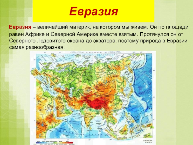 Слайд 11 Евразия – величайший материк, на котором мы живем. Он