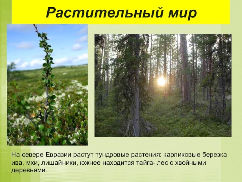 ива, мхи, лишайники, южнее находится тайга- лес с хвойными деревьями.