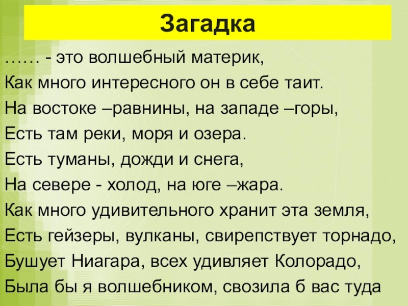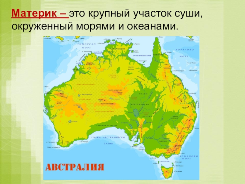Слайд 4 Материк – это крупный участок суши, окруженный морями и