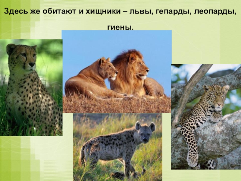 Слайд 34Здесь же обитают и хищники – львы, гепарды, леопарды, гиены.