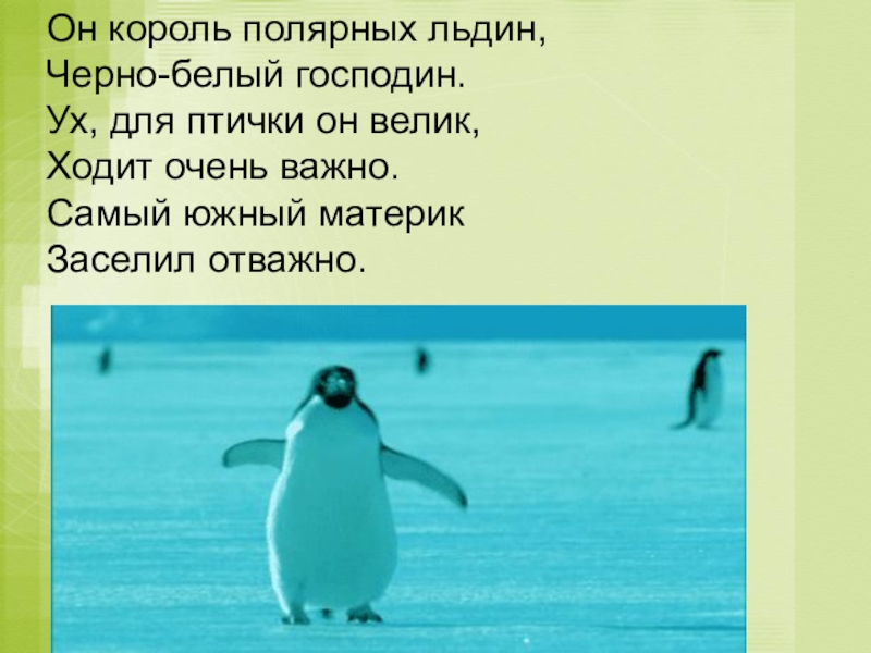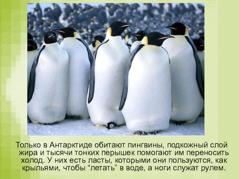 тонких перышек помогают им переносить холод. У них есть ласты, которыми они пользуются, как крыльями, чтобы “летать” в воде, а ноги служат рулем.