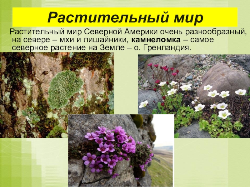 – мхи и лишайники, камнеломка – самое северное растение на Земле – о. Гренландия.