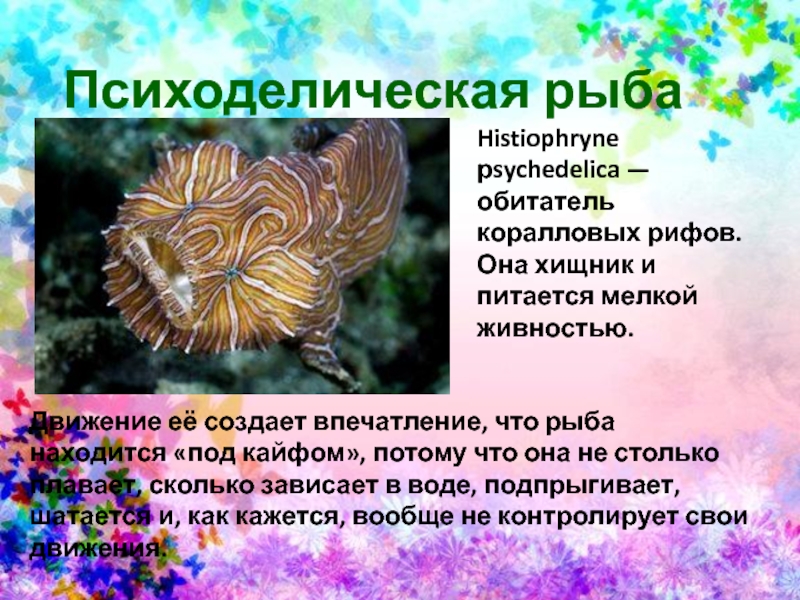 Histiophryne рsychedelica — обитатель коралловых рифов. Она хищник и питается мелкой живностью.