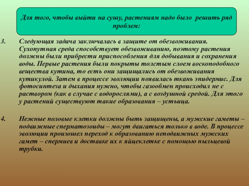 Для того, чтобы выйти на сушу, растениям надо было решить ряд проблем: