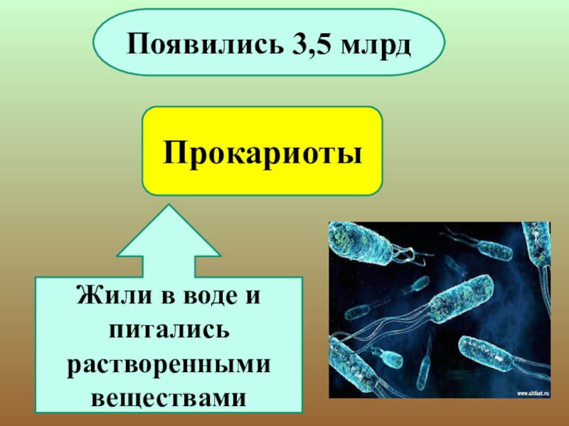 в качестве пищи использовали органические соединения «первичного «бульона». (В осадочных породах древностью 3.5 млрд. лет обнаружены биополимеры). Первыми жителями нашей планеты были анаэробные бактерии.