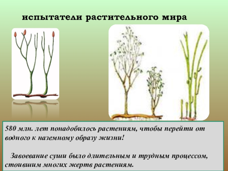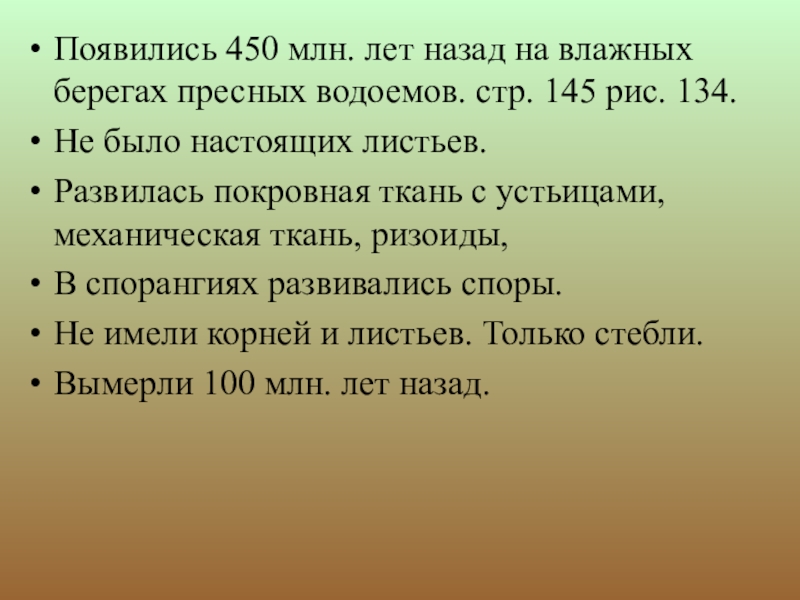 Появились 450 млн. лет назад на влажных берегах пресных водоемов. стр.