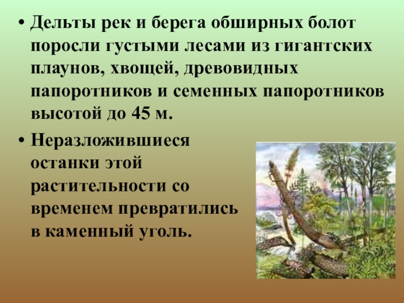 Слайд 39Дельты рек и берега обширных болот поросли густыми лесами из гигантских