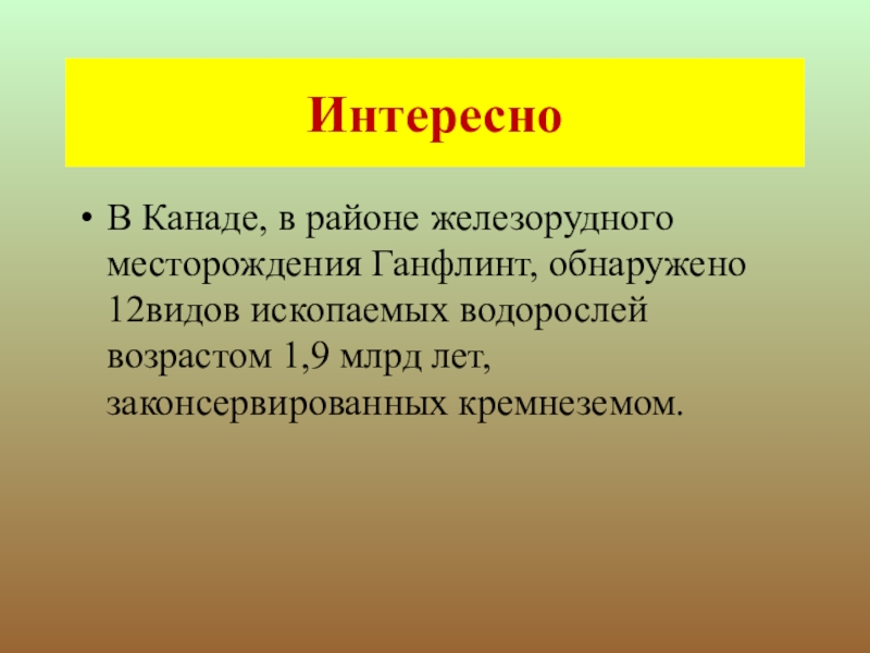 В Канаде, в районе железорудного месторождения Ганфлинт, обнаружено 12видов ископаемых водорослей
