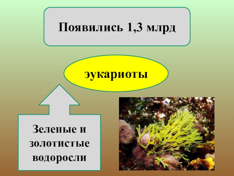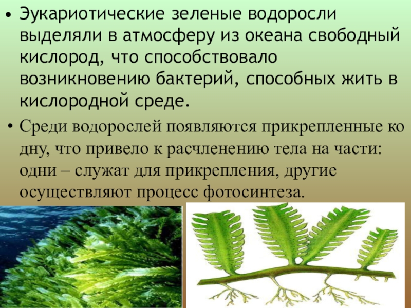 Слайд 23Эукариотические зеленые водоросли выделяли в атмосферу из океана свободный кислород, что