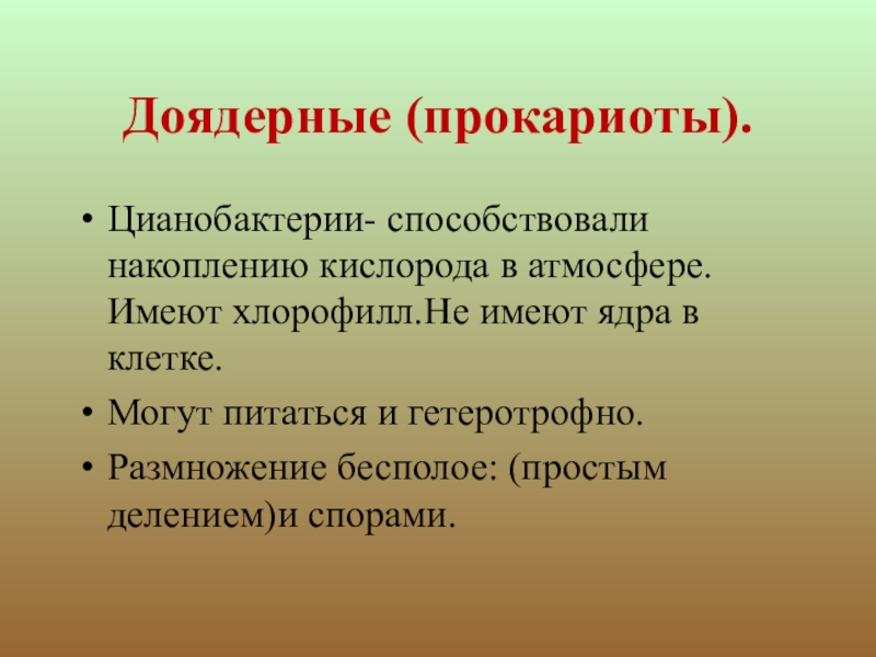 Цианобактерии- способствовали накоплению кислорода в атмосфере. Имеют хлорофилл.Не имеют ядра