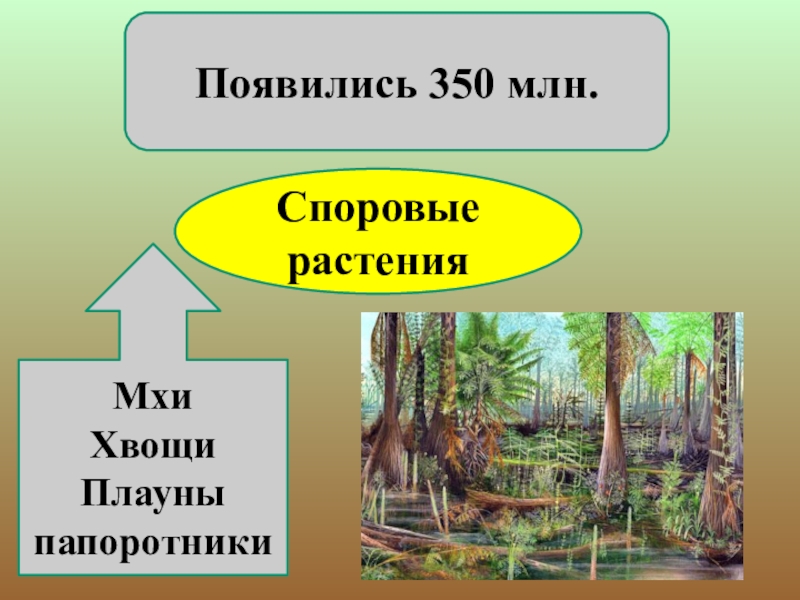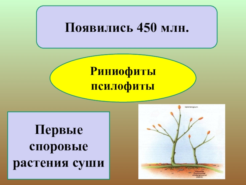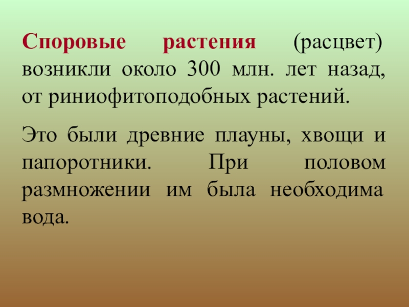 Слайд 37Споровые растения (расцвет) возникли около 300 млн. лет назад, от риниофитоподобных