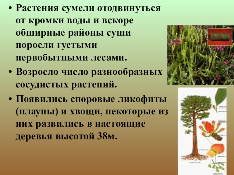 Слайд 38Растения сумели отодвинуться от кромки воды и вскоре обширные районы суши