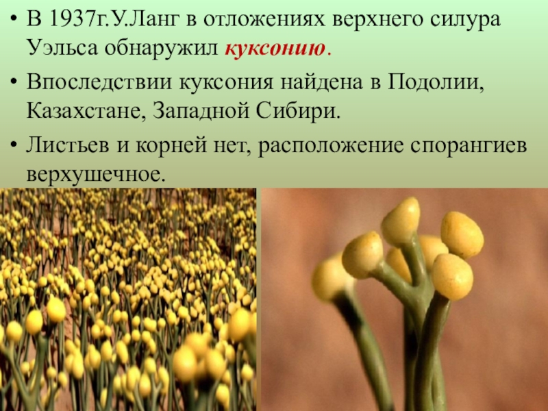 Слайд 31В 1937г.У.Ланг в отложениях верхнего силура Уэльса обнаружил куксонию.
