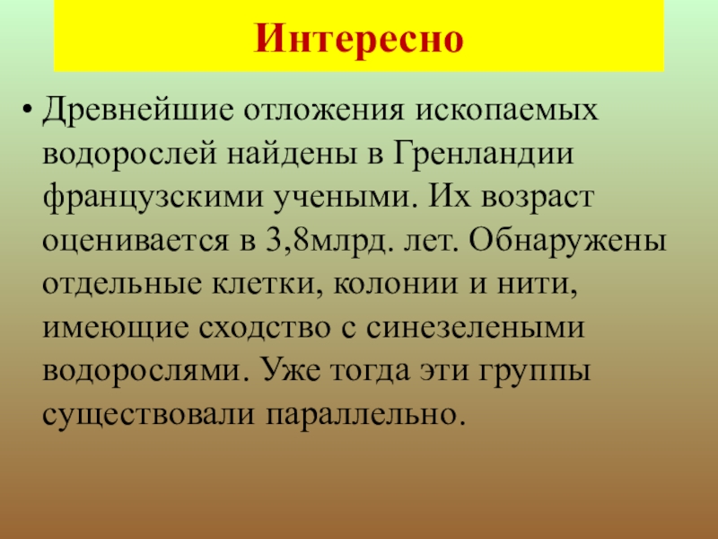 оценивается в 3,8млрд. лет. Обнаружены отдельные клетки, колонии и нити, имеющие сходство с синезелеными водорослями. Уже тогда эти группы существовали параллельно.