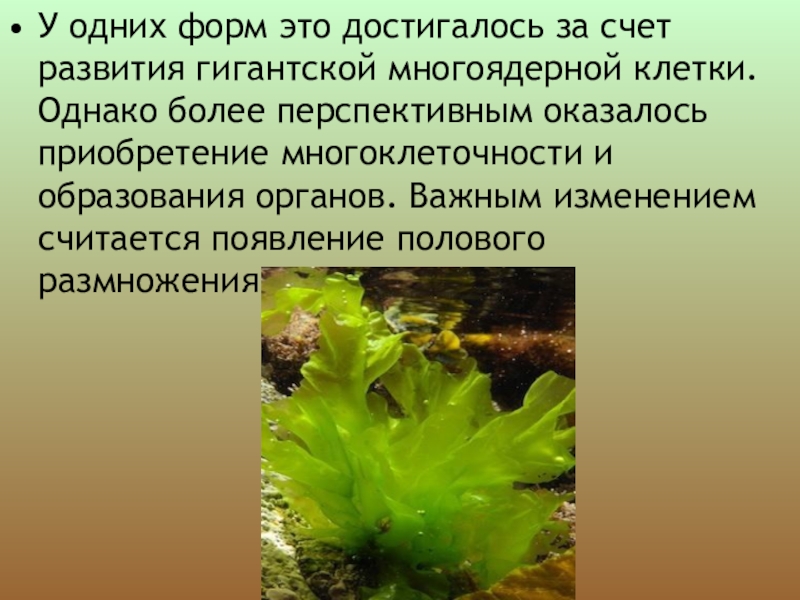 Однако более перспективным оказалось приобретение многоклеточности и образования органов. Важным изменением считается появление полового размножения.