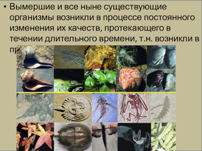 Слайд 11Вымершие и все ныне существующие организмы возникли в процессе постоянного изменения