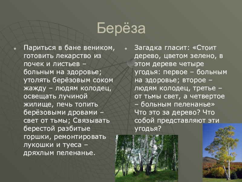 Загадка гласит: «Стоит дерево, цветом зелено, в этом дереве четыре угодья: первое – больным на здоровье; второе – людям колодец, третье – от тьмы свет, а четвертое – больным пеленанье» Что это за дерево? Что собой представляют эти угодья?