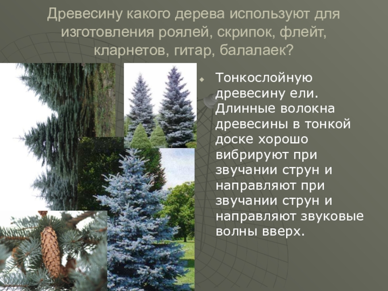 Тонкослойную древесину ели. Длинные волокна древесины в тонкой доске хорошо вибрируют при звучании струн и направляют при звучании струн и направляют звуковые волны вверх.