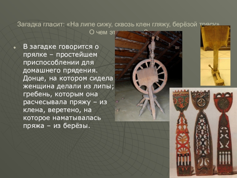 В загадке говорится о прялке – простейшем приспособлении для домашнего прядения. Донце, на котором сидела женщина делали из липы; гребень, которым она расчесывала пряжу – из клена, веретено, на которое наматывалась пряжа – из берёзы.