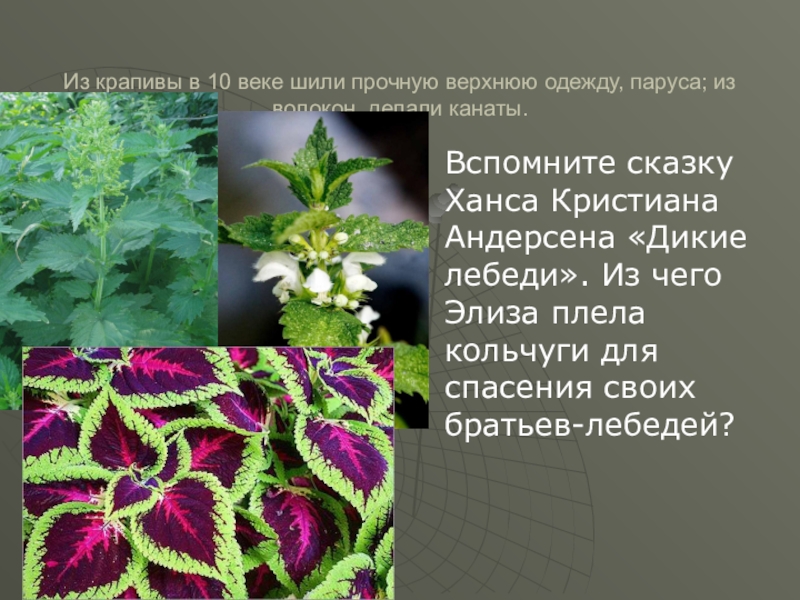Вспомните сказку Ханса Кристиана Андерсена «Дикие лебеди». Из чего Элиза плела кольчуги для спасения своих братьев-лебедей?