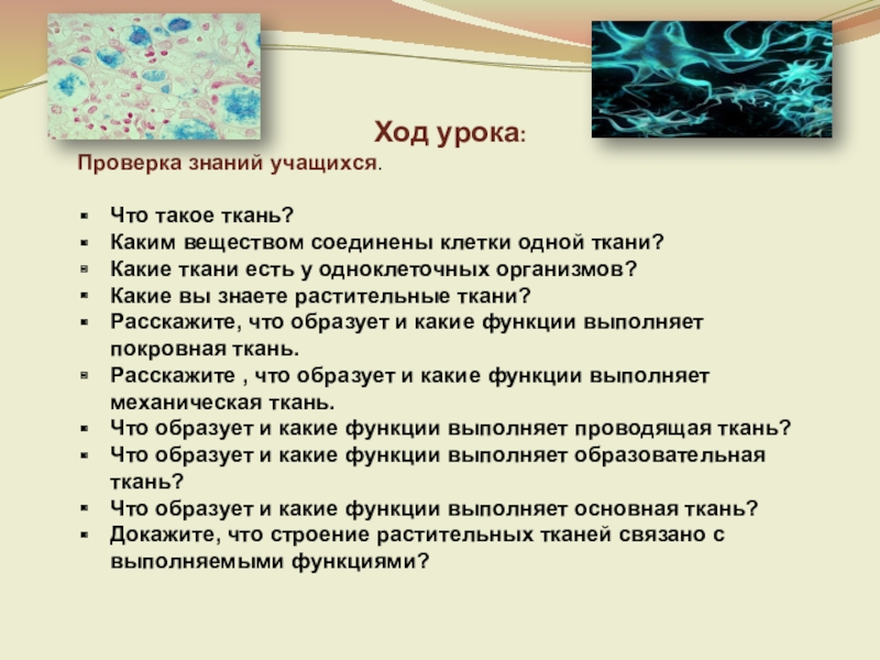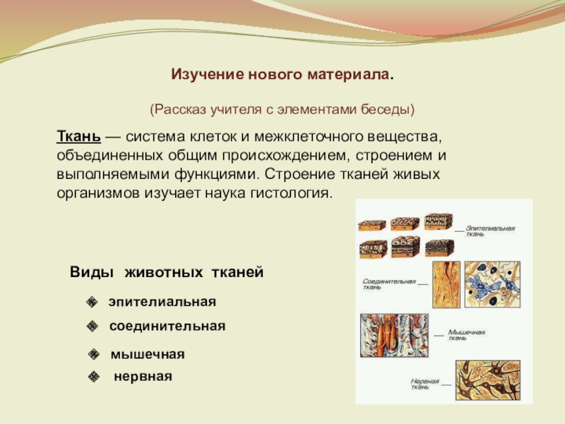 Оборудование: таблицы «Схема строения животной клетки», «Ткани человека»,