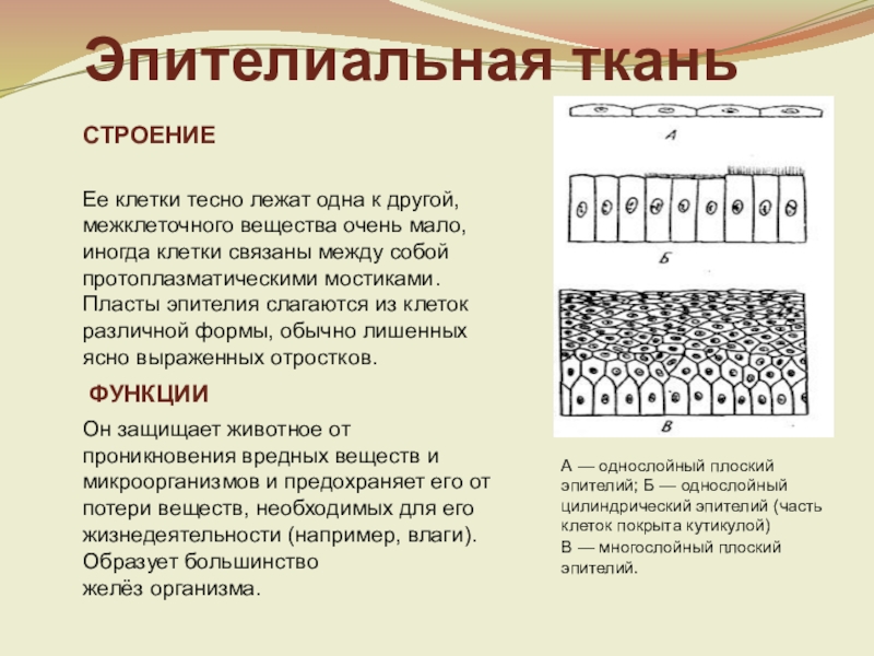 А — однослойный плоский эпителий; Б — однослойный цилиндрический эпителий (часть клеток покрыта кутикулой)