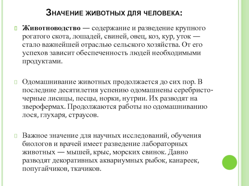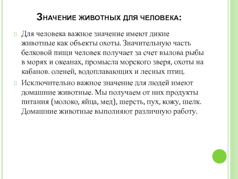 Исключительно важное значение для людей имеют домашние животные. Мы получаем от них продукты питания (молоко, яйца, мед), шерсть, пух, кожу, шелк. Домашние животные выполняют различную работу.