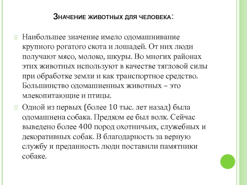 лошадей. От них люди получают мясо, молоко, шкуры. Во многих районах этих животных используют в качестве тягловой силы при обработке земли и как транспортное средство. Большинство одомашненных животных – это млекопитающие и птицы.