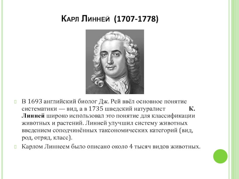 систематики — вид, а в 1735 шведский натуралист К. Линней широко использовал это понятие для классификации животных и растений. Линней улучшил систему животных введением соподчинённых таксономических категорий (вид, род, отряд, класс).