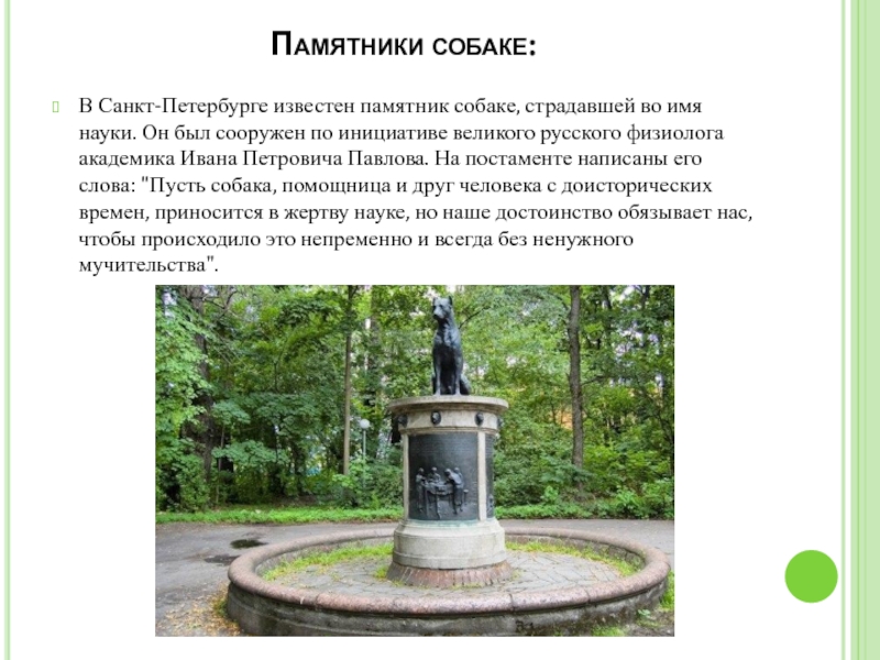 был сооружен по инициативе великого русского физиолога академика Ивана Петровича Павлова. На постаменте написаны его слова: "Пусть собака, помощница и друг человека с доисторических времен, приносится в жертву науке, но наше достоинство обязывает нас, чтобы происходило это непременно и всегда без ненужного мучительства".