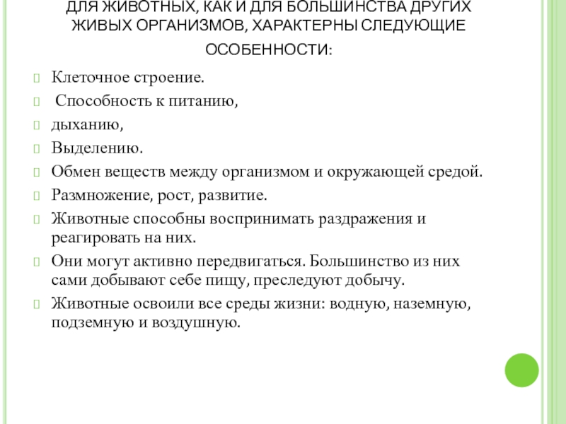 Слайд 14ДЛЯ ЖИВОТНЫХ, КАК И ДЛЯ БОЛЬШИНСТВА ДРУГИХ ЖИВЫХ ОРГАНИЗМОВ, ХАРАКТЕРНЫ СЛЕДУЮЩИЕ
