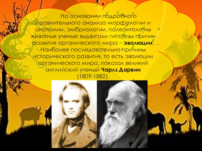 анатомии, эмбриологии, палеонтологии животных ученые выдвигали гипотезы причин развития органического мира – эволюции. Наиболее последовательно причины исторического развития, то есть эволюции органического мира, показал великий английский ученый Чарлз Дарвин (1809-1882).