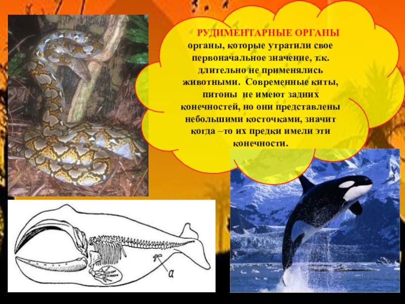 длительно не применялись животными. Современные киты, питоны не имеют задних конечностей, но они представлены небольшими косточками, значит когда –то их предки имели эти конечности.