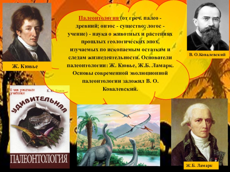 учение) - наука о животных и растениях прошлых геологических эпох, изучаемых по ископаемым остаткам и следам жизнедеятельности. Основатели палеонтологии: Ж. Кювье, Ж.Б. Ламарк. Основы современной эволюционной палеонтологии заложил В. О. Ковалевский.