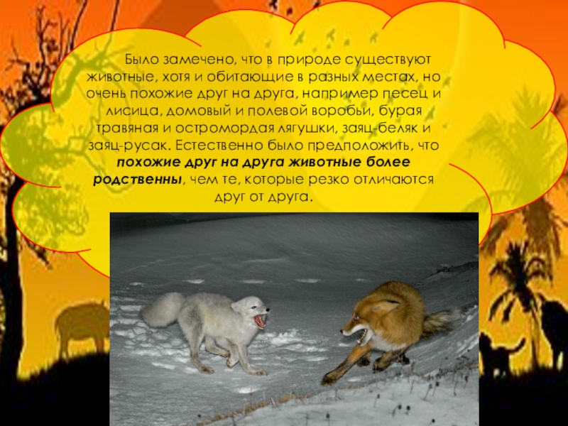 хотя и обитающие в разных местах, но очень похожие друг на друга, например песец и лисица, домовый и полевой воробьи, бурая травяная и остромордая лягушки, заяц-беляк и заяц-русак. Естественно было предположить, что похожие друг на друга животные более родственны, чем те, которые резко отличаются друг от друга.