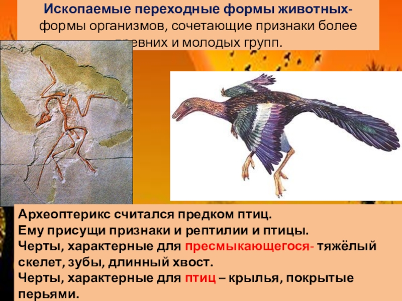 Слайд 20Ископаемые переходные формы животных- формы организмов, сочетающие признаки более древних и