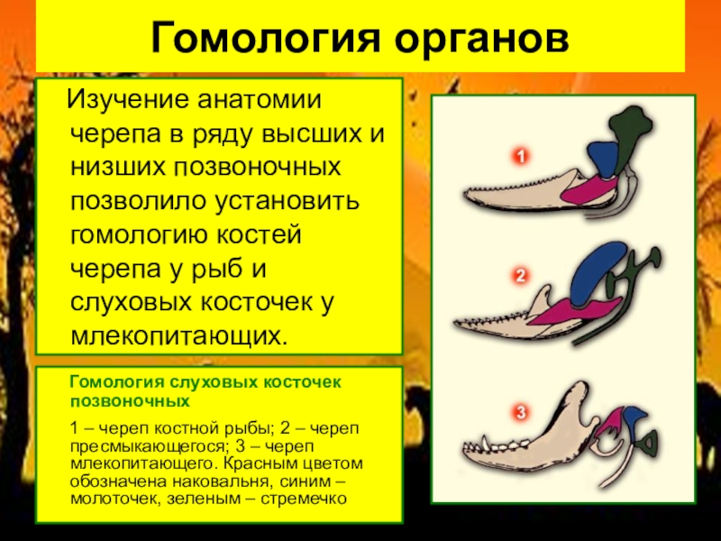 Изучение анатомии черепа в ряду высших и низших позвоночных позволило установить гомологию костей черепа у рыб и слуховых косточек у млекопитающих.