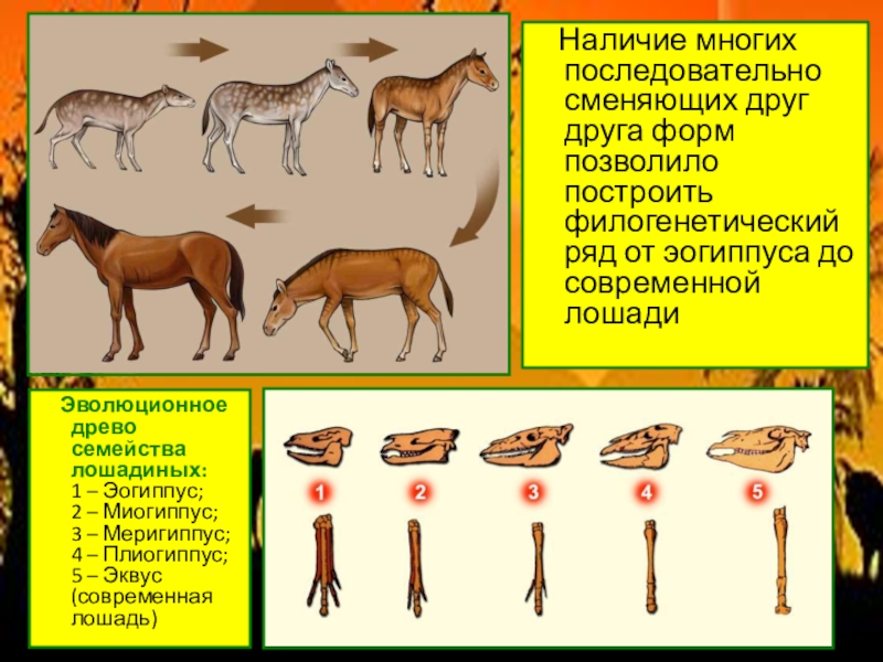 1 – Эогиппус; 2 – Миогиппус; 3 – Меригиппус; 4 – Плиогиппус; 5 – Эквус (современная лошадь)