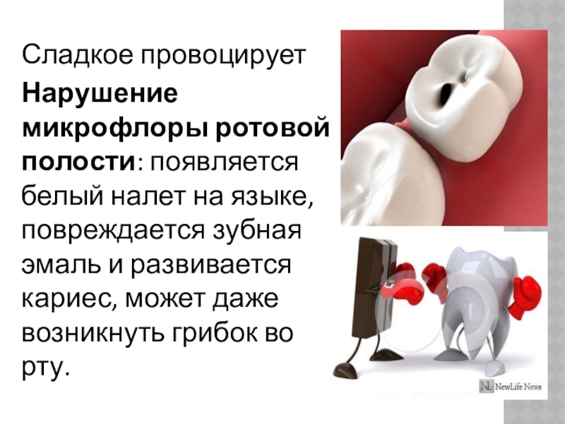 Сладкое провоцирует  Нарушение микрофлоры ротовой полости: появляется белый налет на языке, повреждается зубная эмаль и развивается кариес,