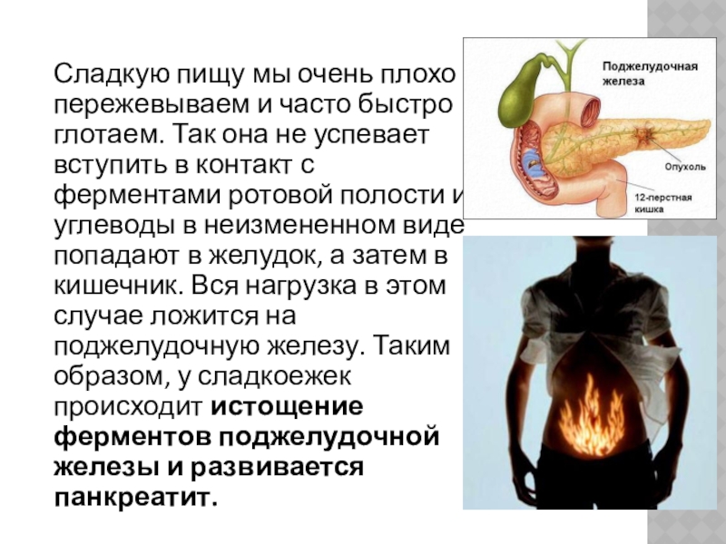 она не успевает вступить в контакт с ферментами ротовой полости и углеводы в неизмененном виде попадают в желудок, а затем в кишечник. Вся нагрузка в этом случае ложится на поджелудочную железу. Таким образом, у сладкоежек происходит истощение ферментов поджелудочной железы и развивается панкреатит.